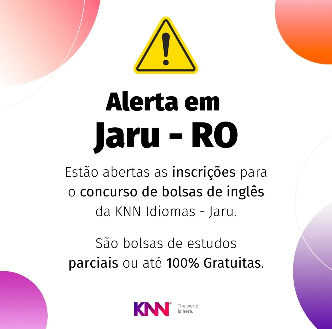 A KNN Idiomas, que agora firmou uma parceria com a Cooperativa de Profissionais em Educação de Jaru (Cooped) para juntos oferecer o melhor para a educação jaruense, informa que estão abertas as inscrições para o concurso de bolsas para o curso de Inglês.