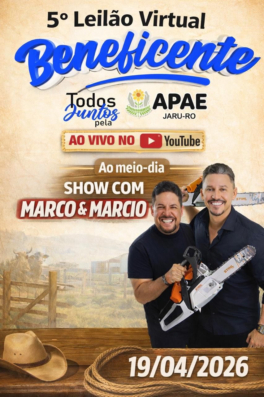 A APAE de Jaru convida toda a comunidade para participar do 5° Leilão Virtual, que acontecerá neste domingo (19), a partir das 11h.
