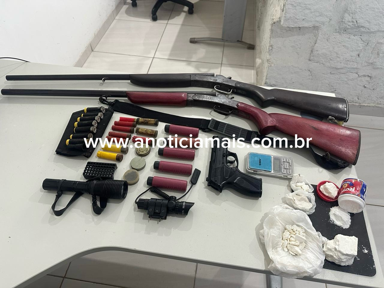 Com autorização da moradora, os policiais entraram na residência para verificar a existência de armas. Durante as buscas, foram encontrados diversos materiais, entre eles: Duas espingardas (calibres 20 e 16); Cartuchos intactos e deflagrados de vários calibres; Tubos com pólvora e esferas para fabricação de munição; Duas caixas de espoletas; Uma balança de precisão e porções de substâncias semelhantes a cocaína e crack.
