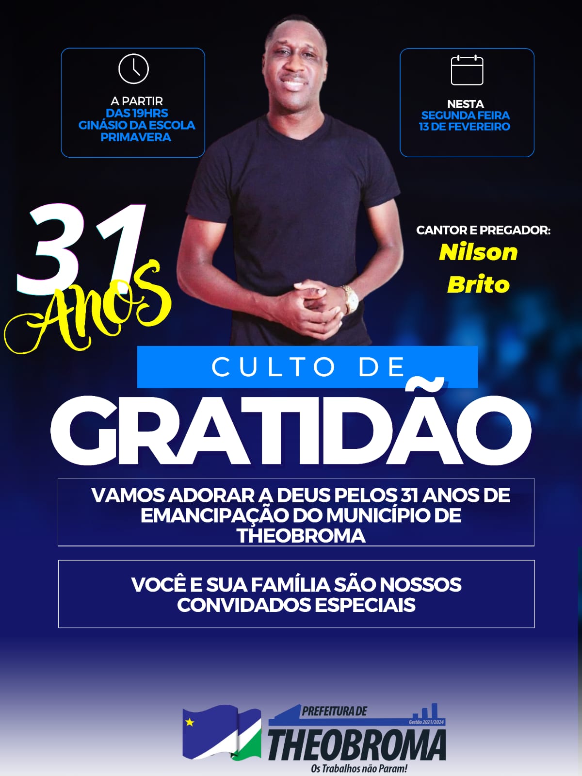 A Administração Municipal está convidando à toda população, para celebrar os 31 anos de emancipação político administrativa do município de Theobroma.