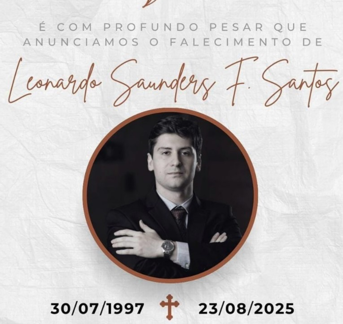 “Com imenso pesar e dor no coração, comunico o falecimento de meu sobrinho, Leonardo Saunders Fernandes Santos, filho do desembargador Délcio Santos e de minha querida Huguette, ocorrido na madrugada deste sábado, aos 27 anos. Leonardo, jovem advogado de grandes virtudes, partiu de forma precoce, deixando em todos nós uma saudade irreparável e a lembrança de sua alegria, inteligência e afeto. Neste momento de profunda tristeza, uno-me à minha irmã, cunhado, toda minha família e amigos, compartilhando a mesma dor e rogando a Deus que nos conforte e nos dê forças para suportar tamanha perda”, disse o presidente do Tribunal de Justiça do Amazonas