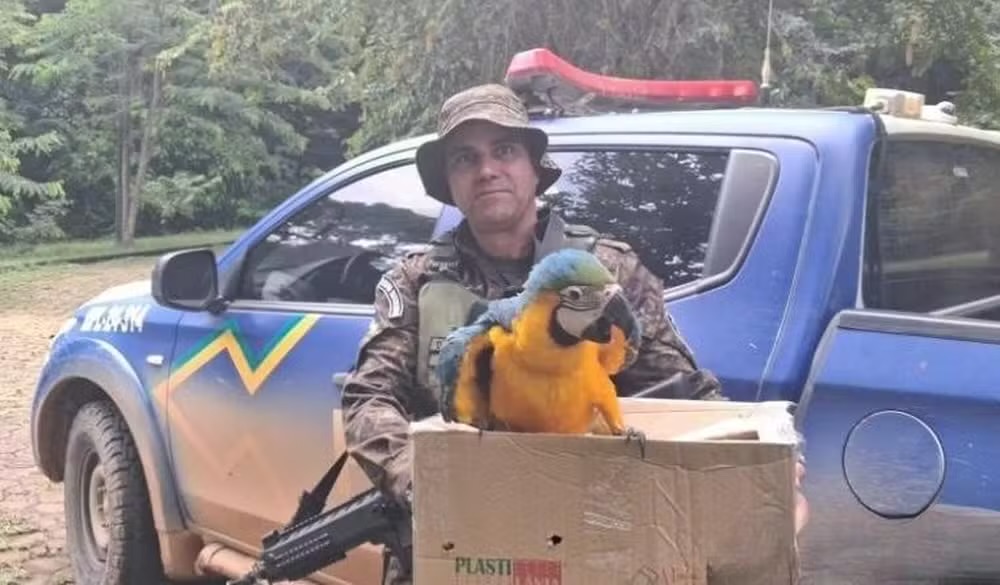 Uma arara-canindé foi resgatada pelo 2ª Companhia de Polícia Ambiental nesta semana em Machadinho d’Oeste (RO). O pássaro foi resgatado com ferimentos em uma das asas.