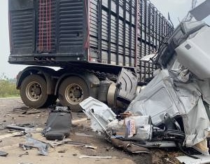 O choque do caminhão boiadeiro contra o outro veículo de carga foi tão violento que o painel, com volante e tudo, ficou jogado no meio da pista, enquanto o motorista, ainda não identificado, agonizou nas ferragens até ir a óbito.