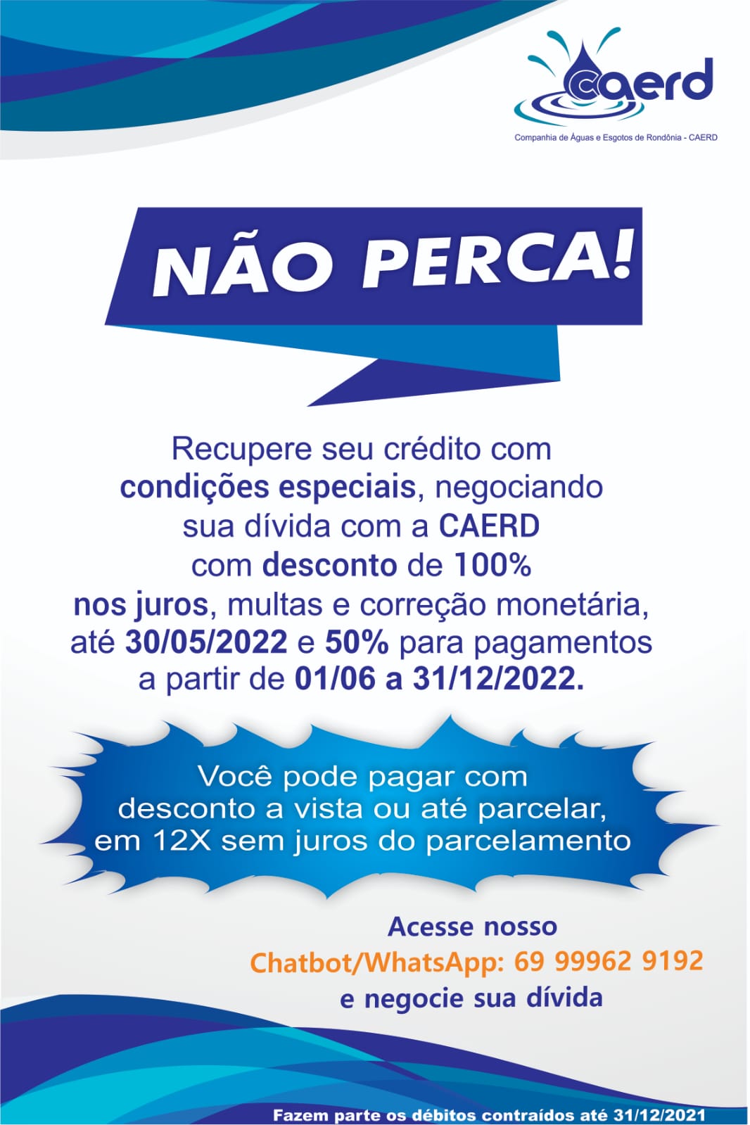 As negociações poderão ser feitas em todas as lojas de atendimento nos 37 municípios. A lista com os endereços está disponível no Portal Transparencia da Caerd. Para quem prefere a comodidade da internet, é possível fazer a negociação pelo chatbot/WhatsApp (69) 99962 9192 ou através do “Pingo” pelo Site: www.caerd-ro.com.br.
