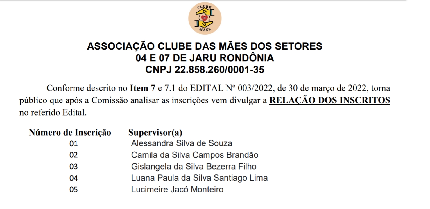 Clube das Mães de Jaru divulga relação dos inscritos no Edital n° 003/2022