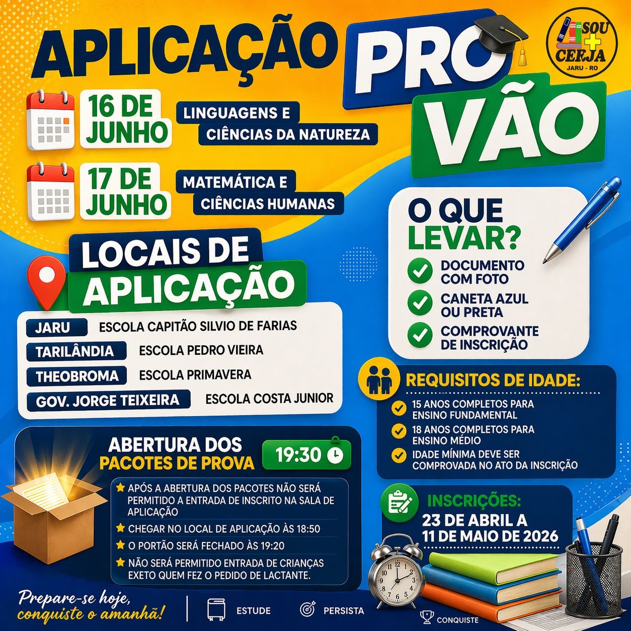 A Direção do Centro Estadual de Educação de Jovens e Adultos (CEEJA) de Jaru comunica à população de Jaru, Theobroma, Governador Jorge Teixeira e do distrito Tarilândia, que as inscrições para o Provão 2026 para o Ensino Fundamental 1 (1° ao 4°), Ensino Fundamental 2 (5º ao 8°) e Médio (1º ao 3º), iniciaram nesta quinta-feira (23) e se encerram no próximo dia 11 de maio.