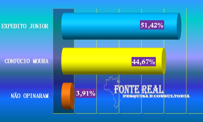 A última pesquisa de opinião pública para o segundo turno das eleições para o Governo de Rondônia, o candidato Expedito Junior (PSDB) conseguiu atingir mais da metade dos percentuais de intenção de votos, segundo pesquisa divulgada agora há pouco pelo Instituto Fonte Real. Expedito Junior possui na véspera de eleição 51,42% das intenções de voto contra 44,67% do candidato da reeleição Confúcio Moura. O percentual de indecisos soma 3,91%.