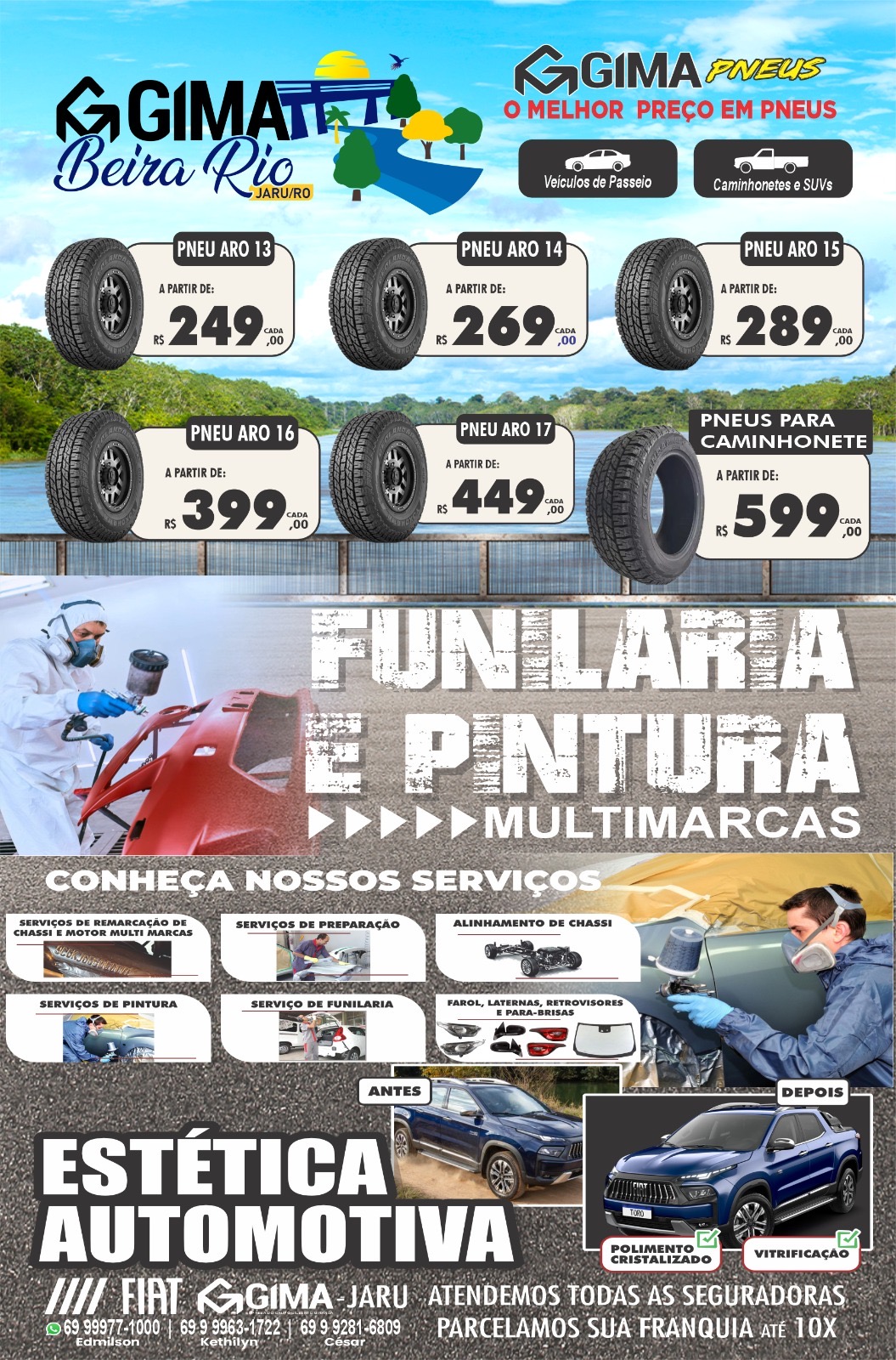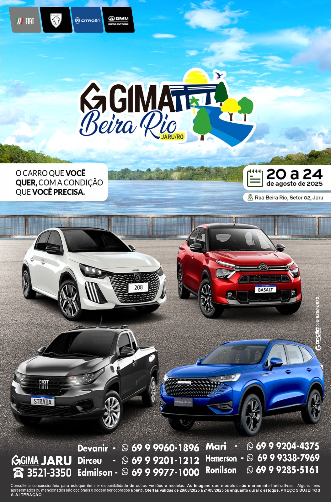 A concessionária Fiat Gima vem realizando desde esta quarta-feira (20) um mega evento promocional em Jaru. Teve início o Feirão Gima Beira Rio, com promoções incríveis em veículos novos e seminovos das marcas Fiat, Citroën, Peugeot e GWM Mega Motors, peças, serviços e o melhor preço em pneus.