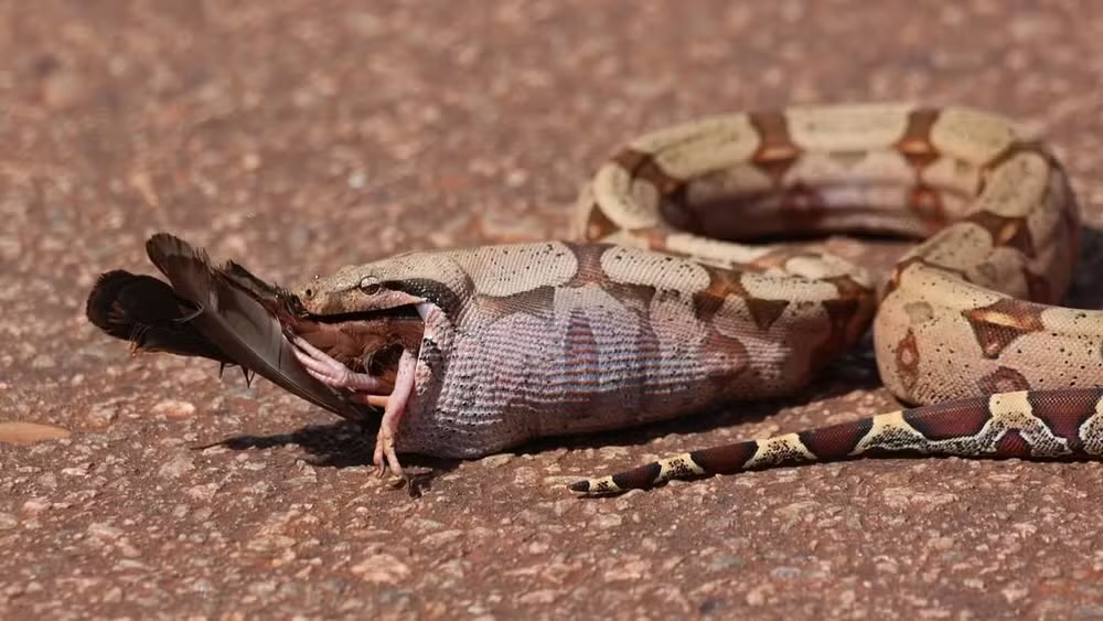 Um momento raro da natureza foi registrado pelo fotógrafo Carlos Tuyama, de Rondônia, enquanto ele caminhava pelas ruas de Paraupebas (PA). Ele conseguiu fotografar o exato instante em que uma jiboia engolia um passarinho.