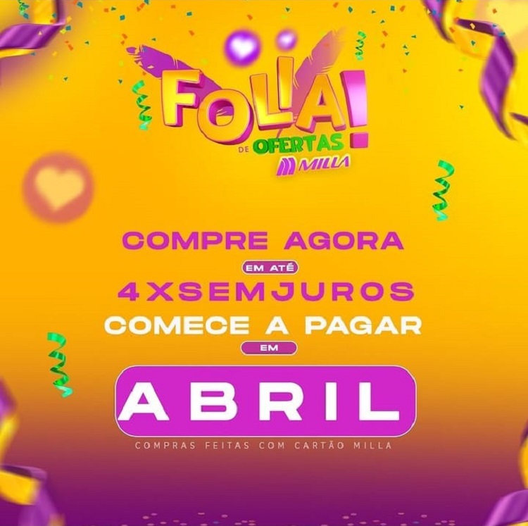 A Lojas Milla de Jaru vem realizando mais uma grande promoção! Na Folia de Ofertas Milla, você parcela sua compra em até 4 vezes sem juros com Cartão Milla e só começa a pagar no próximo mês de abril.