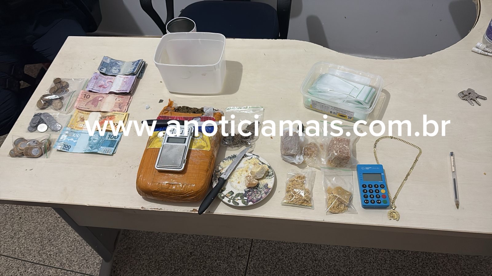 No local foram apreendidas grandes quantidades de maconha e crack, além de balança de precisão, materiais utilizados para embalar as drogas e outros objetos possivelmente ligados à atividade criminosa.