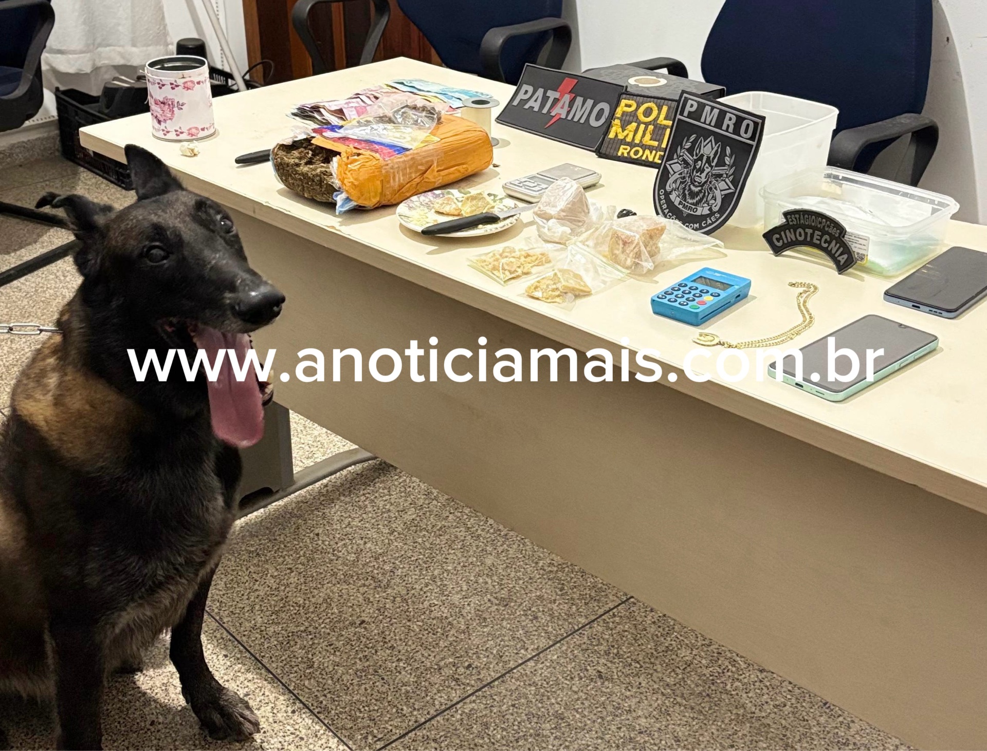 Durante a ação, equipes do Patamo e do Canil da Polícia Militar foram acionadas para dar apoio à ocorrência. Nas buscas realizadas nas residências, o cão farejador auxiliou os policiais indicando locais onde havia drogas escondidas, o que levou à localização de entorpecentes.