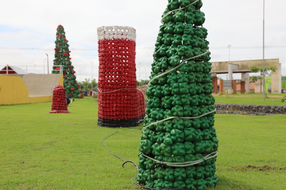 A maior parte dos enfeites, que deixam a cidade mais colorida nesse período do ano, foram confeccionados a partir de materiais recicláveis, principalmente garrafas pets.