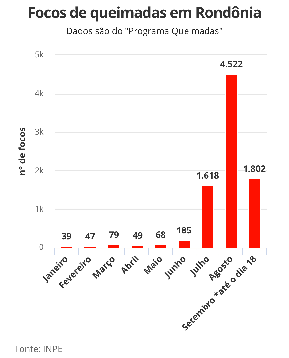 Este ano, até o dia 18 de setembro, 8.407 focos de incêndios foram registrados em Rondônia, de acordo com o “Programa Queimadas”, do Instituto Nacional de Pesquisas Espaciais (Inpe). Essa é a maior quantidade em cinco anos para o período.