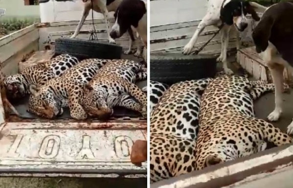 Conforme o vídeo, as onças são dois filhotes e a mãe. Um homem diz que os animais estavam em uma árvore. Depois de mortas, elas foram colocadas em uma caminhonete ao lado de dois cachorros.