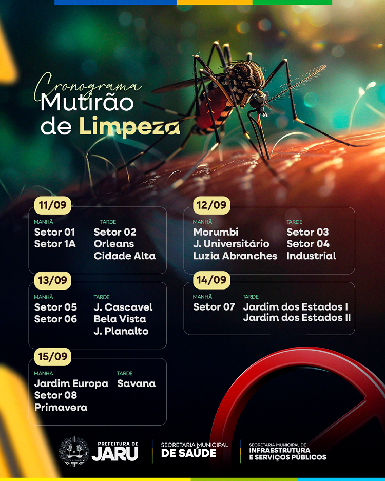 A Prefeitura de Jaru, por meio da Secretaria de Infraestrutura e Serviços Públicos – Seminsp e Secretaria Municipal de saúde – Semusa, realizará entre os dias 11 e 15 de setembro, mais um mutirão de limpeza em todos os bairros do município, nos períodos da manhã e tarde.