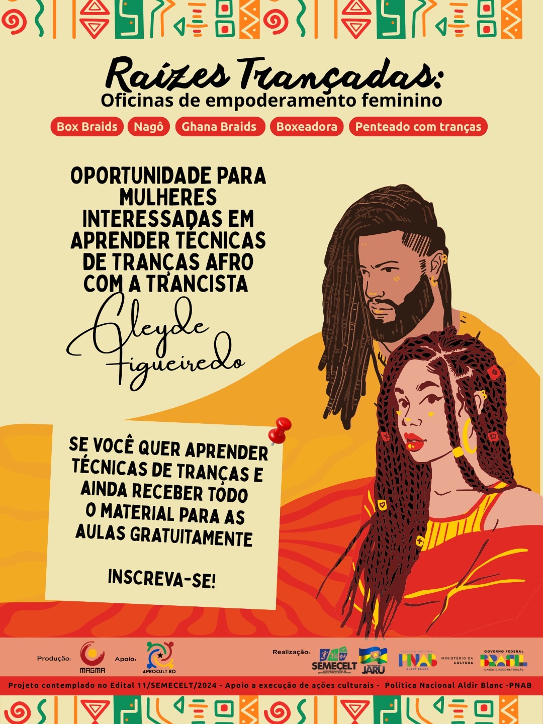 O projeto Raízes Trançadas – Oficina de Empoderamento Feminino, idealizado pela Associação Pró-Cultura Rondônia (Aprocult.RO) em parceria com a trancista Cleyde Figueiredo, está com inscrições abertas em Jaru e irá selecionar 10 mulheres para participar de uma formação presencial em técnicas de tranças afro, com foco na valorização da cultura afro-brasileira, no fortalecimento da identidade e na geração de renda.