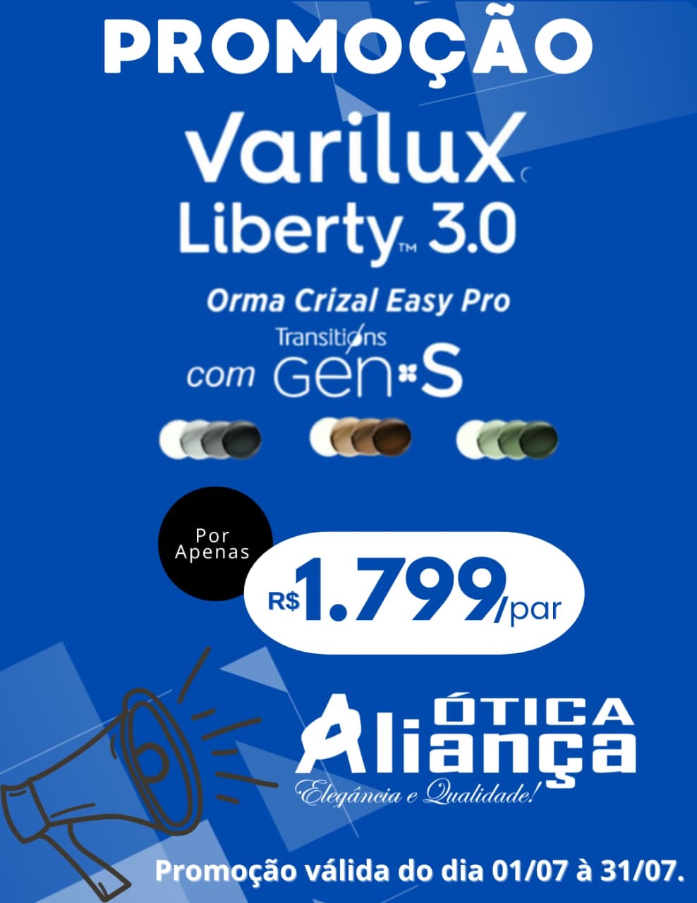 A Ótica Aliança está com uma promoção imperdível neste mês de julho, lentes Varilux Liberty 3.0 Orma Crizal Easy Pro com Transitions, de R$ 3.449,00 por apenas R$ 1.799,00. É isso mesmo: tecnologia, conforto com um descontão exclusivo!