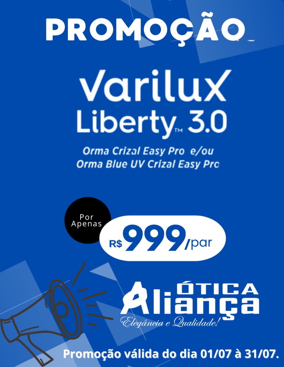 Mas corra, que essa promoção é válida somente até o dia 31 de julho. Aproveite agora mesmo e renove seus óculos com qualidade e economia!