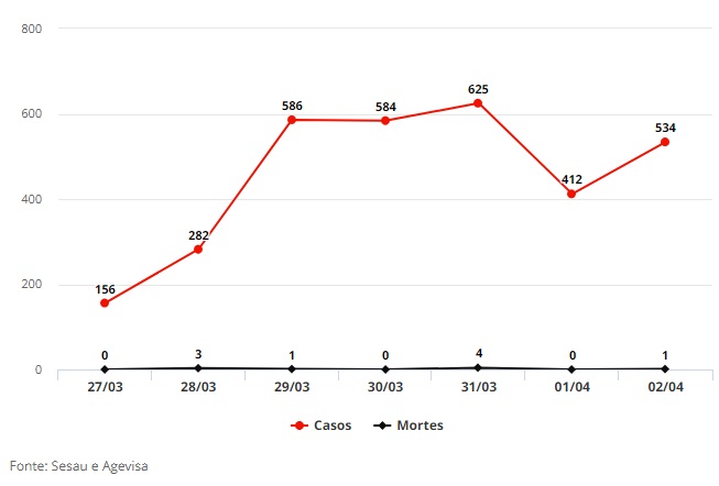 A quinta-feira (31) foi o dia com maior registro de novos casos e óbitos durante a semana, sendo 625 testes positivos e 4 vidas perdidas. Confira no gráfico abaixo os dados dia a dia: