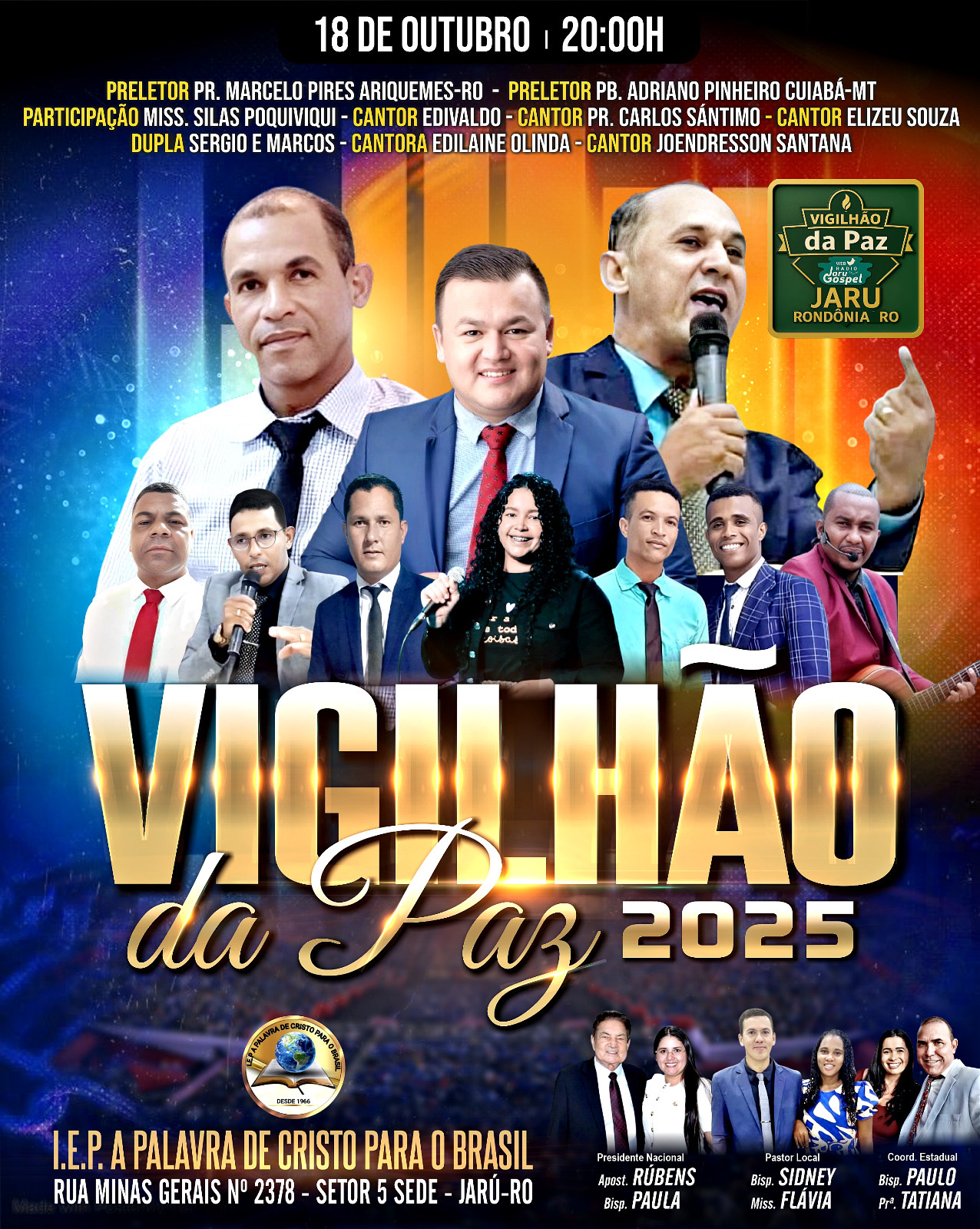 Atenção Jaru e região, vem aí o Vigilhão da Paz 2025, com o tema: “Meu alvo é o Céu”! O grande evento religioso acontecerá no próximo dia 18 de outubro, a partir das 20h, no templo sede da Igreja Evangélica Pentecostal a Palavra de Cristo para o Brasil, localizada à rua Minas Gerais n° 2378, no Setor 05 de Jaru.